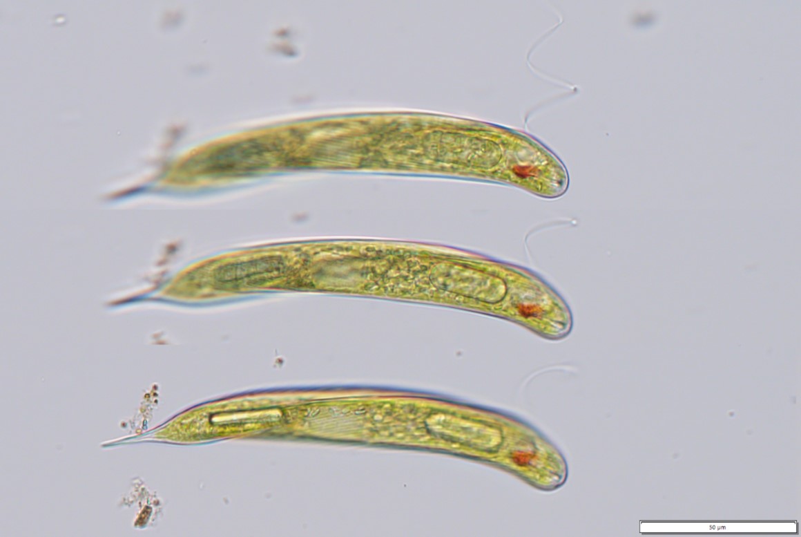 Waterproef heeft sinds kort een nieuw fytoplanktonteam. Om alle soorten goed te blijven herkennen, volgen onze medewerkers regelmatig cursussen. In het voorjaar van 2025 stond de groep Euglenophyta centraal, ook wel oogwiertjes genoemd. Deze algen zijn vaak prachtig groen en herkenbaar aan hun opvallende rode oogvlek.
